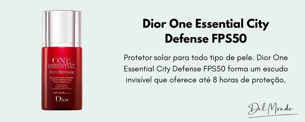Protetor solar para todos os tipos de pele. Dior One Essential City Defense FPS50 forma um escudo invisível que oferece até 8 horas de proteção. Protege contra toxinas com sua ação tripla anti poluição: contra aderência, contra penetração e antioxidação, além de filtros poderosos UVA e UVB e PA ++++.